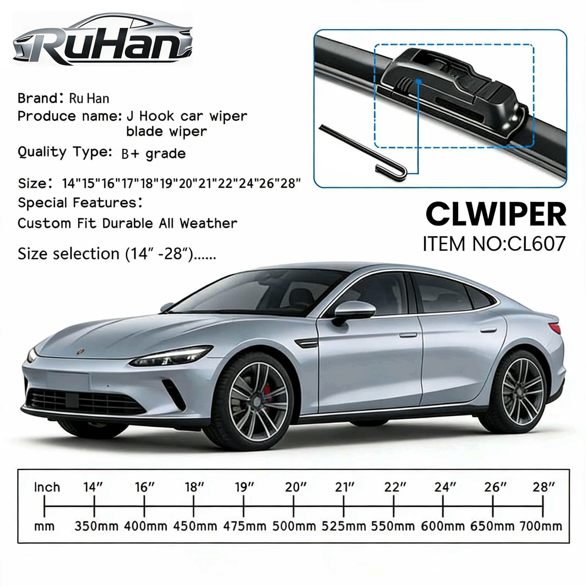 Precision Flexible Hook System (9×4 mm, 9×3 mm): Equipped with a high-precision flexible hook interface, these blades allow for quick, tool-free installation, securely locking onto standard wiper arms and maintaining stable, vibration-free performance even at high speeds.